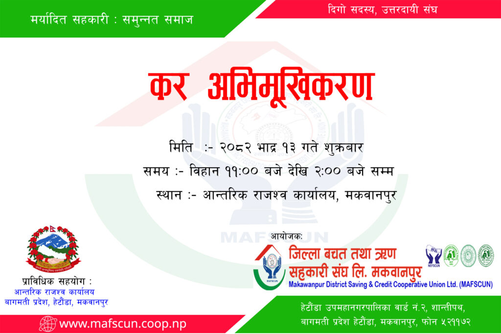 उक्त कार्यक्रम २०८२ भाद्र १३ गते शुक्रबारका दिन आन्तरिक राजश्व कार्यालयको सभाहलमा ठिक विहान ११ः०० बजेबाट शूरु हुने छ ।
