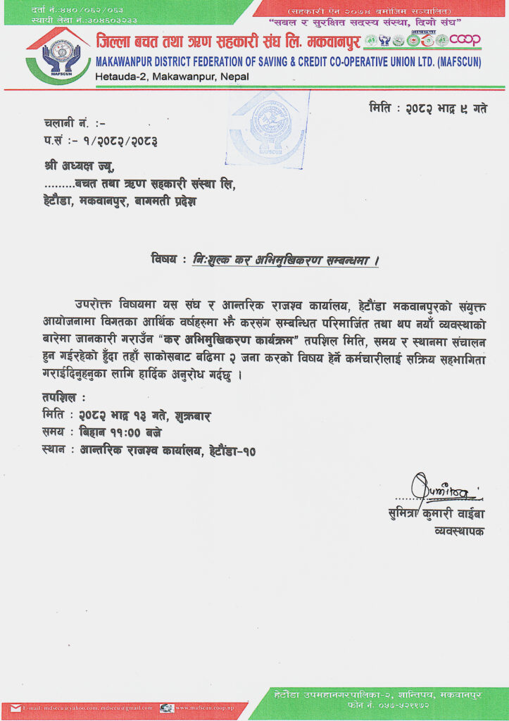 जिल्ला बचत संघले वार्षिक कार्यक्रम अन्र्तगत आफ्ना सदस्यहरुको लागि आन्तरिक राजश्व कार्यालयसंगको समन्वयमा १ दिने कर अभिमूखिकरण कार्यक्रम गर्न लागेको हो । उक्त कार्यक्रममा प्रत्येक संस्थाबाट २ जना कर्मचारीलाई सहभागी गराईने छ । वार्षिक रुपमा फेरवदल हुने करसंग सम्बन्धित तथा परिमार्जित नयां व्यवस्थाको बारेमा जानकारी दिन संघले पत्राचार गरेको हो ।